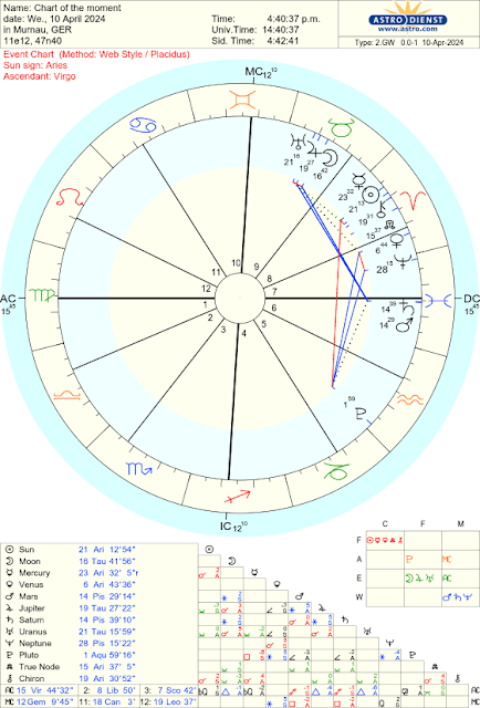 A second one of this week is Mercury, the critical world/word , on its way backwards through Aries, a week of 'setting' in the light of the Sun, the subjective will, on April 22nd, on its way back to 16° Aries and, again forward, catching up with the Sun again at the end of May.