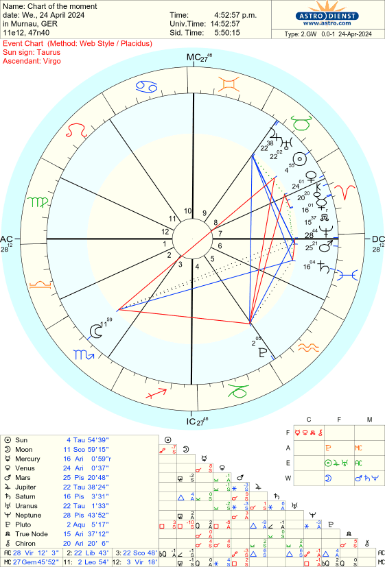 Here, not only Mars /Moon are resonantly connected with Saturn and Neptune by square and opposition. Neptune is also in transit to the red Mars/Earth Uranus of the King conjunction in the Fire- element and the Sun on Mars of the Earth conjunction.